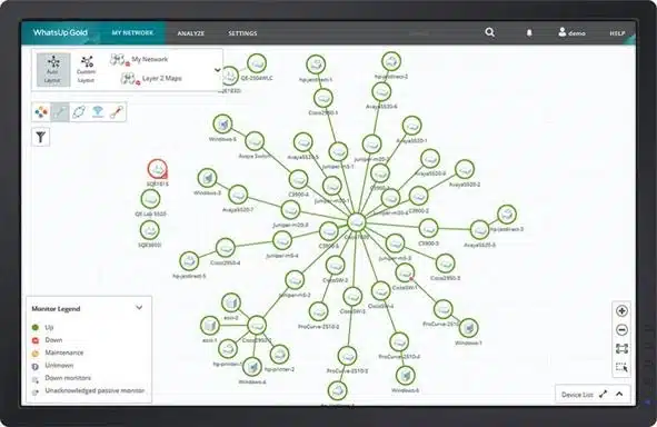 WhatsUp Gold’s discovery en mapping tool combineert Layer 2 en Layer 3 discovery methodes om uitgebreide, interactieve netwerkkaarten te creëren die gemakkelijk aangepast kunnen worden. Het ontdekt en verzamelt informatie van elk netwerk met behulp van layer 2/3 ontdekkingstechnieken, waaronder SNMP, ARP, ICMP, Virtual Infrastructure Management, IP-adressering, CDP, LLDP, enz. WhatsUp Gold creëert vervolgens dynamische layer 2 maps die beheerders een uitgebreid beeld geven van hun gehele infrastructuur.