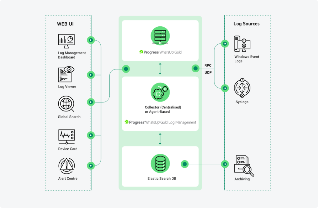 WhatsUp Gold Log Management brengt apparaatloginformatie binnen handbereik. U kunt Windows event logs en syslogs verzamelen, deze beheren en/of visualiseren vanaf de kaart of aanpasbare dashboards en waarschuwingen activeren onder specifieke omstandigheden. Configureer zoekopdrachten in logboeken en exporteer de resultaten automatisch of op aanvraag. Archiveer logboeken om aan de regelgeving te voldoen of om historische gegevens te bewaren. Vereenvoudig uw leven wanneer logs onderdeel worden van uw diagnoseproces voor netwerkproblemen.